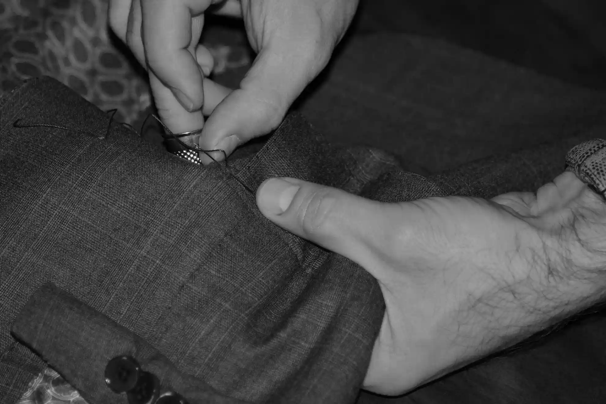TAILORING PROCESS Once the suit's design has been decided, with the aid of chalk, the suit's lines are drawn out and then move on to the delicate cutting and stitching stage. The fabric is cut and begin the structure of Neapolitan hand-basted canvasing. The Jacket build around a full floating special canvas—components of the Jacket such as lapels, collars, and chest part of the canvas stitching meticulously in multi-direction and forming the elements to the body shape by using special stitching and ironing techniques.